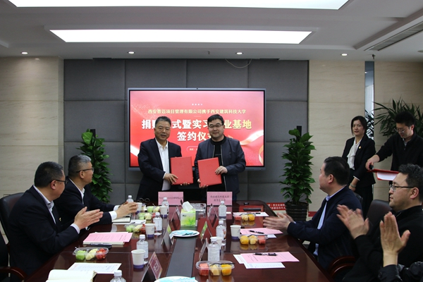 2023年4月10日下午,公司攜手西安建筑科技大學(xué)教育基金會、土木工程學(xué)院、管理學(xué)院舉行捐贈儀式暨實(shí)習(xí)就業(yè)基地簽約儀式。公司黨支部書記、董事長李三虎,總經(jīng)理景亞杰,副總經(jīng)理趙建軍、王斌、王永軍(兼總工程師)、盧彬,總經(jīng)理助理曹淑萍,辦公室主任任瑩,西安建筑科技大學(xué)校董校友會(教育基金會)辦公室主任于鵬,創(chuàng)新創(chuàng)業(yè)教育辦公室主任趙會朋,黨委巡察辦常務(wù)副主任李家輝,土木工程學(xué)院黨委副書記、副院長王永亮,管理學(xué)院副處級輔導(dǎo)員周琳,教育基金管理部部長張廣敏,土木工程學(xué)院學(xué)生工作辦公室主任屈鵬飛出席儀式。儀式由公司總經(jīng)理景亞杰主持。