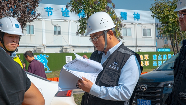 時值深秋,歷經(jīng)幾場秋雨的洗滌,關(guān)中平原已然變得涼爽濕潤,但中國西電西安智慧產(chǎn)業(yè)園項目的建設勢頭依舊熱火朝天,這里塔吊林立,機械轟鳴,全無秋天的蕭瑟,而是一派生機盎然的壯闊之景。此時,一位監(jiān)理人正在工地上巡檢,他精神抖擻,目光如炬。只見他熟練地運用著測量工具,細致地核驗著每一處施工細節(jié)。