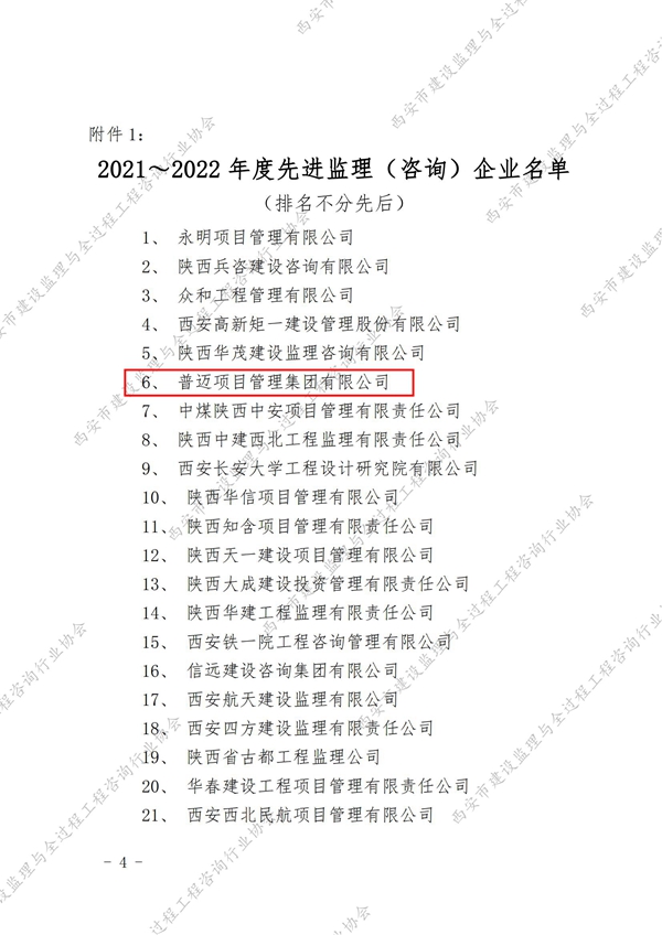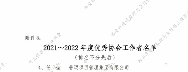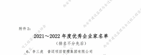 近日,陜西省建設(shè)監(jiān)理協(xié)會、西安市建設(shè)監(jiān)理與全過程工程咨詢行業(yè)協(xié)會分別發(fā)布2021-2022 年度行業(yè)優(yōu)秀企業(yè)和個人榮譽(yù)名單,普邁項目管理集團(tuán)有限公司榮獲2021-2022 年度西安市“年度先進(jìn)監(jiān)理(咨詢)企業(yè)”,董事長李三虎榮獲2021-2022 年度西安市“優(yōu)秀企業(yè)家”,另有32名員工分別榮獲省級、市級“優(yōu)秀總監(jiān)理工程師”“優(yōu)秀專業(yè)監(jiān)理工程師”“優(yōu)秀監(jiān)理員”“優(yōu)秀協(xié)會工作者”榮譽(yù)稱號。