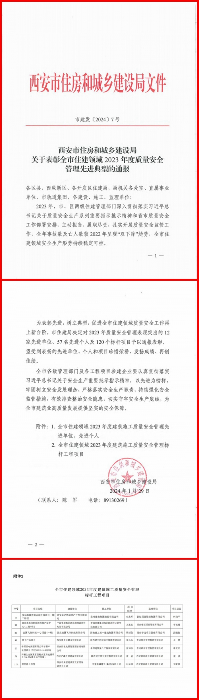 2024年1月29日,西安市住房和城鄉(xiāng)建設(shè)局發(fā)布《西安市住房和城鄉(xiāng)建設(shè)局關(guān)于表彰全市住建領(lǐng)域2023年度質(zhì)量安全管理先進(jìn)典型的通報(bào)》,我公司承監(jiān)的愛琴海城市商業(yè)綜合體項(xiàng)目一期二標(biāo)段、西北水電及新能源科技產(chǎn)業(yè)中心(二期)項(xiàng)目、云翼飛行訓(xùn)練中心項(xiàng)目(一期)、奧卡廣場項(xiàng)目、中國西電集團(tuán)有限公司智慧產(chǎn)業(yè)園項(xiàng)目(西區(qū))HX19-3-56宗地、浐灞生態(tài)區(qū)夏家堡村安置房建設(shè)項(xiàng)目(1#-20#樓及地下車庫)、昆明路公租房等7個(gè)項(xiàng)目入圍全市住建領(lǐng)域2023年度建筑施工質(zhì)量安全管理標(biāo)桿工程項(xiàng)目榜單!