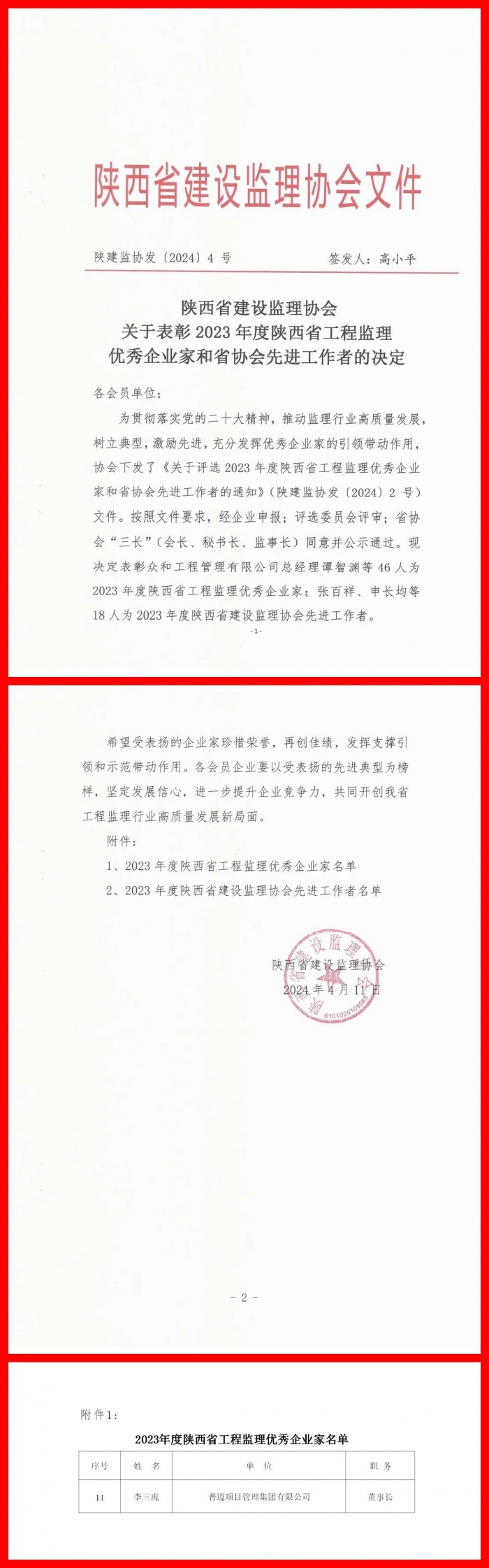 2024年4月11日,陜西省建設(shè)監(jiān)理協(xié)會(huì)發(fā)布了《關(guān)于表彰2023年度陜西省工程監(jiān)理優(yōu)秀企業(yè)家和省協(xié)會(huì)先進(jìn)工作者的決定》,公司董事長(zhǎng)李三虎獲評(píng)“2023年度陜西省工程監(jiān)理優(yōu)秀企業(yè)家”榮譽(yù)稱號(hào)!