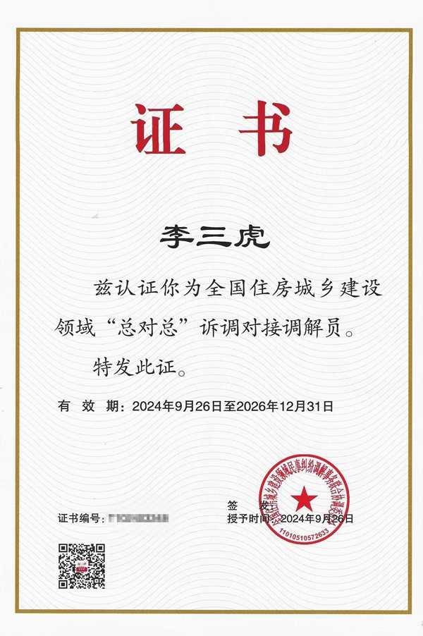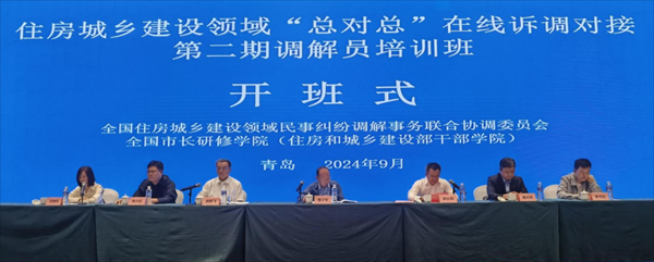 為深入推進住房城鄉(xiāng)建設領域民事糾紛“總對總”在線訴調(diào)對接試點工作,不斷提高調(diào)解員規(guī)范化、專業(yè)化水平,9月24日-26日,由全國住房城鄉(xiāng)建設領域民事糾紛調(diào)解事務聯(lián)合協(xié)調(diào)委員會(以下簡稱全國住建聯(lián)調(diào)委)主辦、全國市長研修學院(住房和城鄉(xiāng)建設部干部學院)承辦的“住房城鄉(xiāng)建設領域‘總對總’在線訴調(diào)對接第二期調(diào)解員培訓班”在山東省青島市舉辦,700多人參加培訓。我公司董事長李三虎作為中價協(xié)資深會員、陜價協(xié)推薦中價協(xié)聘任全國住建聯(lián)調(diào)委認證的調(diào)解員參加了本次培訓學習。