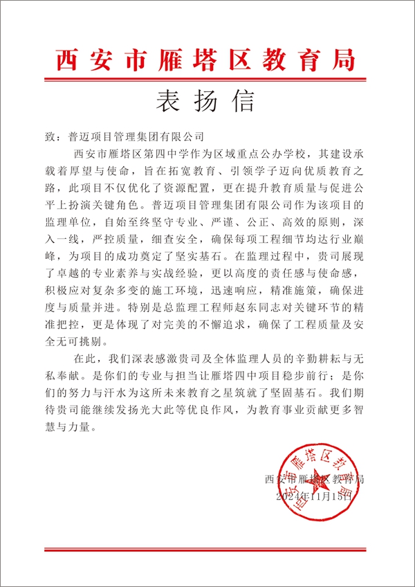 2024年11月15日,公司收到一封來(lái)自西安市雁塔區(qū)教育局的表?yè)P(yáng)信,表?yè)P(yáng)信對(duì)西安市雁塔區(qū)第四中學(xué)建設(shè)工程的監(jiān)理服務(wù)工作質(zhì)量予以充分肯定和認(rèn)可!該項(xiàng)目由我公司第十五事業(yè)部承監(jiān),信中還特別對(duì)公司及總監(jiān)理工程師趙東帶領(lǐng)的項(xiàng)目監(jiān)理服務(wù)團(tuán)隊(duì)提出了感謝和表?yè)P(yáng)!