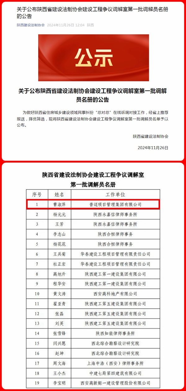 11月26日,陜西省建設(shè)法制協(xié)會公布了建設(shè)工程爭議調(diào)解室第一批調(diào)解員名單,我公司曹淑萍同志憑借突出的專業(yè)素養(yǎng)和豐富的實踐經(jīng)驗成功入選。