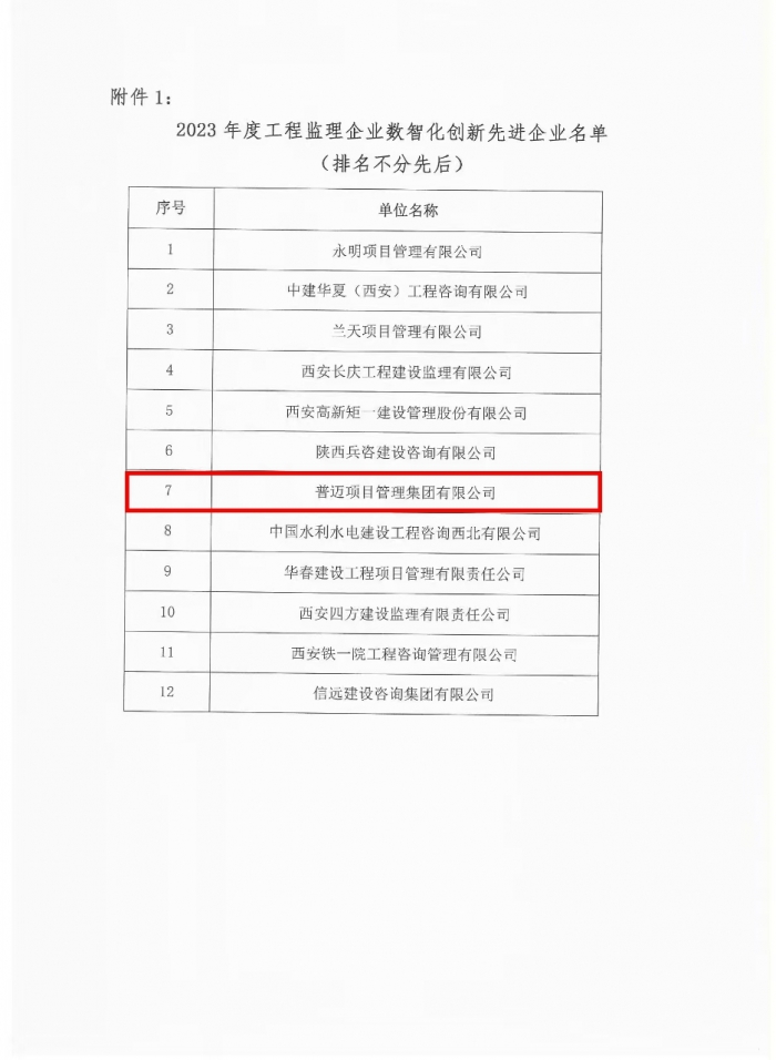 2025年1月24日,陜西省建設(shè)監(jiān)理協(xié)會發(fā)布《關(guān)于陜西省工程監(jiān)理數(shù)智化創(chuàng)新應(yīng)用及先進(jìn)工作者評選結(jié)果的公告》,普邁項(xiàng)目管理集團(tuán)有限公司憑借在工程監(jiān)理數(shù)智化應(yīng)用方面的突出表現(xiàn),獲評“2023年度工程監(jiān)理企業(yè)數(shù)智化應(yīng)用先進(jìn)企業(yè)”。同時,公司辦公室主任任瑩同志榮獲“2024年度陜西省建設(shè)監(jiān)理協(xié)會先進(jìn)工作者”榮譽(yù)稱號。