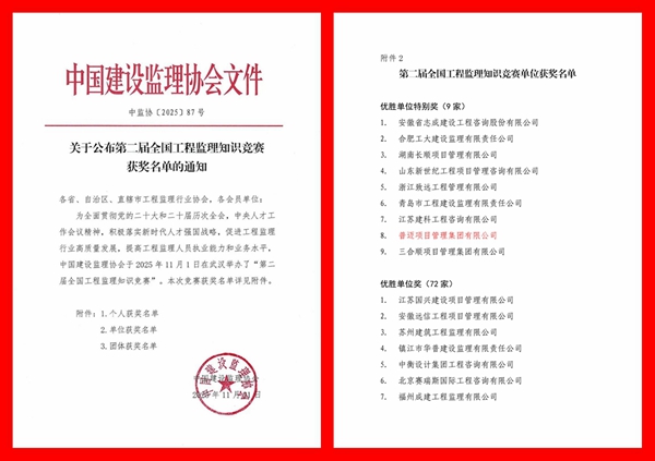 2025年11月21日,中國建設監(jiān)理協(xié)會公布了第二屆全國工程監(jiān)理知識競賽獲獎名單,公司從全國諸多參賽單位中脫穎而出,榮獲優(yōu)勝單位特別獎!