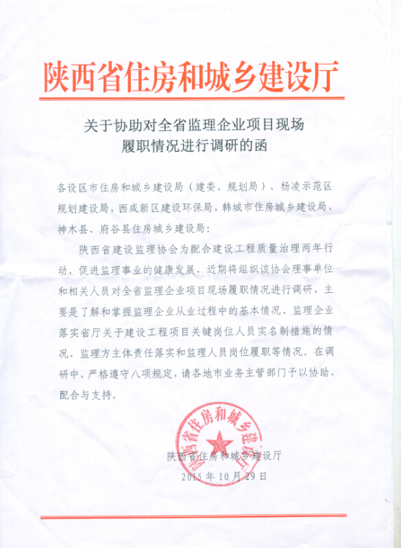關(guān)于協(xié)助對(duì)全省監(jiān)理企業(yè)項(xiàng)目現(xiàn)場(chǎng)履職情況進(jìn)行調(diào)研的函
