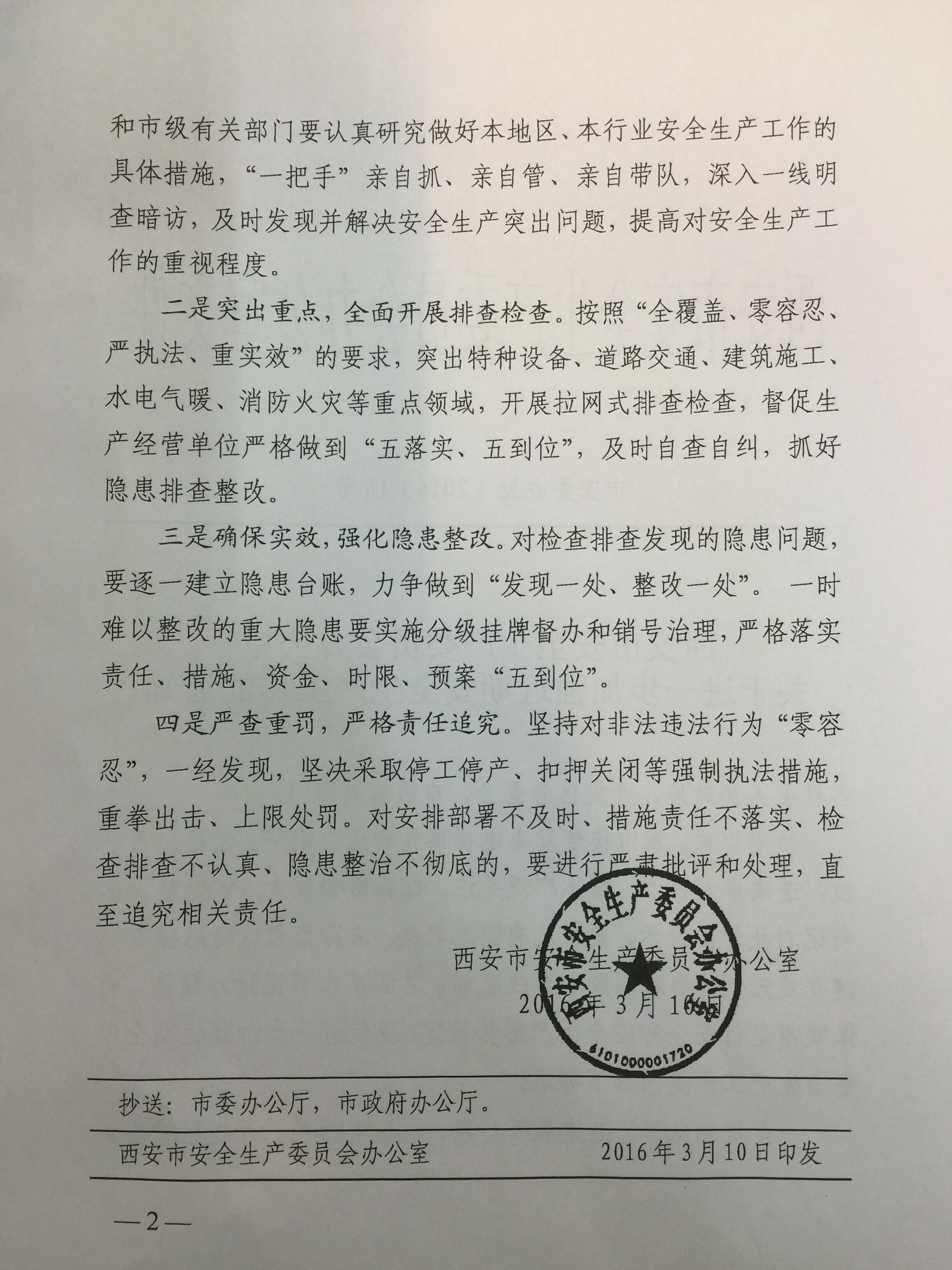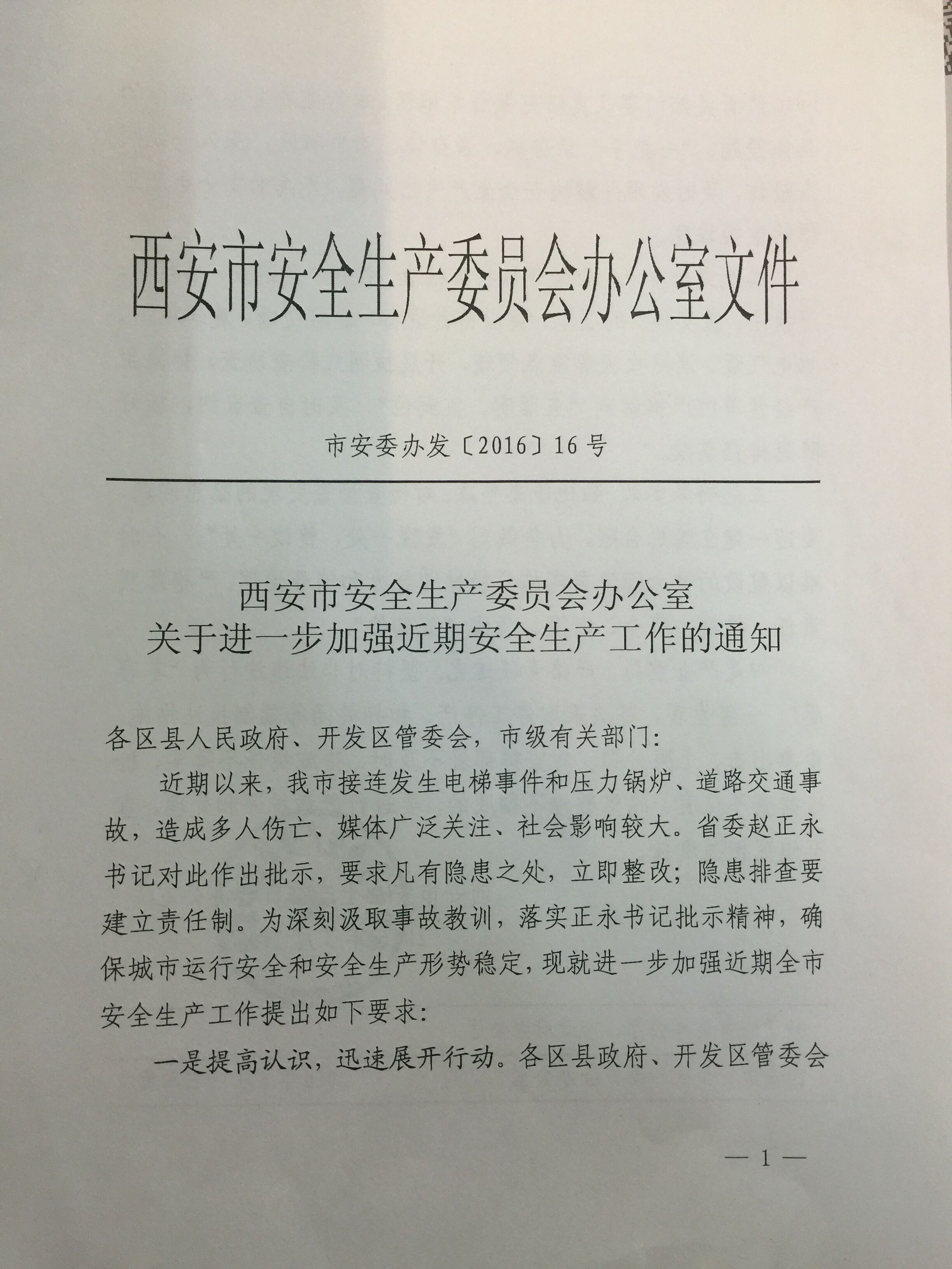 西安市安全生產(chǎn)委員會辦公室關于進一步加強近期安全生產(chǎn)工作的通知