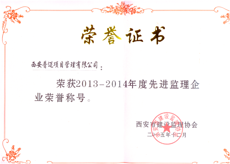 獲得2013-2014年度“西安市先進(jìn)工程監(jiān)理企業(yè)”