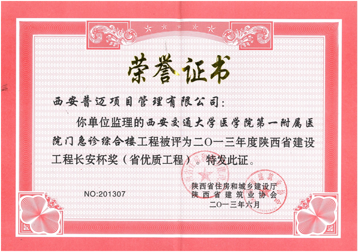 獲得2013年度陜西省建設(shè)工程長安杯獎(jiǎng)(省優(yōu)質(zhì)工程)