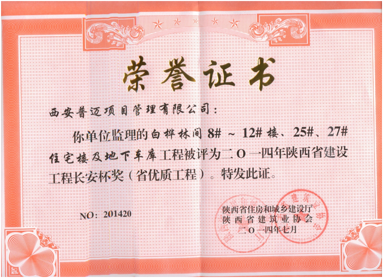 獲得2014年度陜西省建設(shè)工程長安杯獎(省優(yōu)質(zhì)工程)