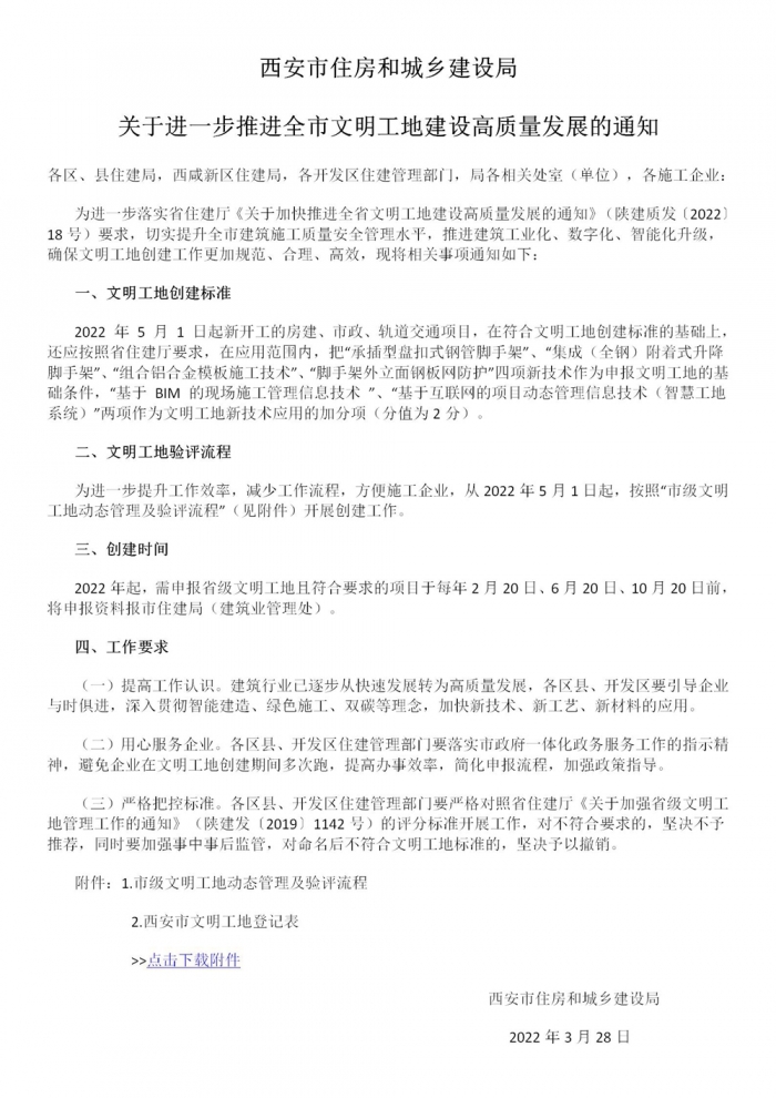 西安市住房和城鄉(xiāng)建設(shè)局關(guān)于進(jìn)一步推進(jìn)全市文明工地建設(shè)高質(zhì)量發(fā)展的通知