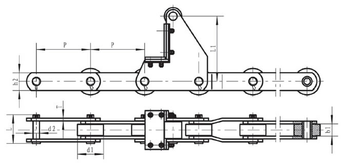 Chain no. | Pitch P (mm) | Inner width of inner link b1 (mm) | Diameter of roller d1 (mm) | Diameter of pin d2 (mm) | Length of pin L (mm) | Height of sidebar h2 (mm) | Thickness of sidebar T (mm) | Width of attached plate L1 (mm) | Tensile strength Q (KN) |