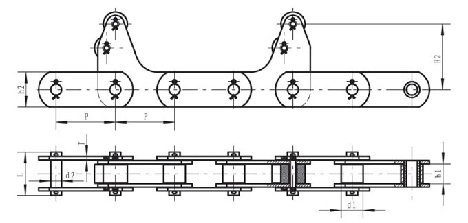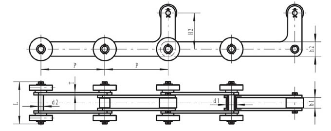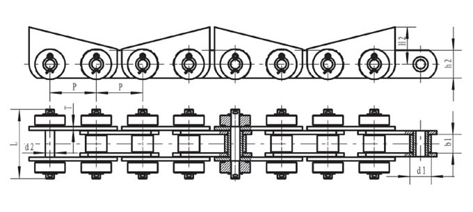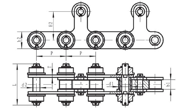 Pitch P (mm) | Inner width of inner link b1 (mm) | Diameter of roller d1 (mm) | Diameter of pin d2 (mm) | Length of pin (mm) | Height of sidebar h2 (mm) | Thickness of sidebar T (mm) | Height of top chain H2 (mm) | Tensile strength Q (KN) |