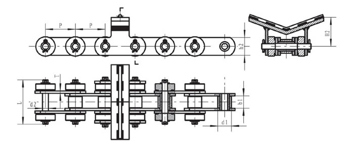 Pitch P (mm) | Inner width of inner link b1 (mm) | Diameter of roller d1 (mm) | Diameter of pin d2 (mm) | Length of pin L (mm) | Height of sidebar h2 (mm) | Thickness of sidebar T (mm) | Height of top plate H2 (mm) | Tensile strength Q (KN) |