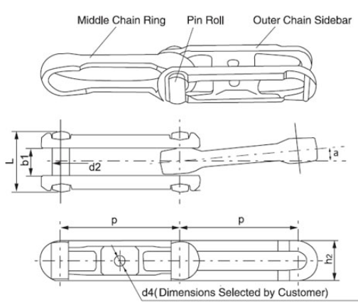 Standard | Chain No. | Reference pitch P (mm) | Diameter of pin d2 (mm) | Length of pin L (mm) | Standard length (min/max) (mm) | Number of pitch within standard length | Sideward bending angle α (°) | Width of sidebar h2 (mm) | Tensile strength (KN) | Weight per meter (kg/m) |