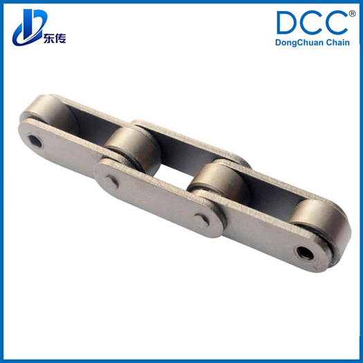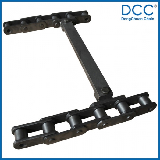 鏈條主要用于工程機械,鋪路機使用,鏈條為雙排鏈,在兩鏈條間裝配刮板,我們在裝配刮板的部位采用焊接工藝,并在鏈板中間沖定位孔,焊接附件用油壓機壓入鏈板后再進行焊接,增強附件的焊接牢固度,中間的刮板用中碳鋼熱處理,使刮板強度更高,更耐磨。并用平面磨床磨平刮板的兩平面,減少鏈條與設(shè)備間的間隙,通過以上這些工藝措施,鏈條的使用壽命得以大大的提高。