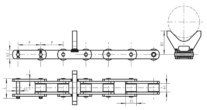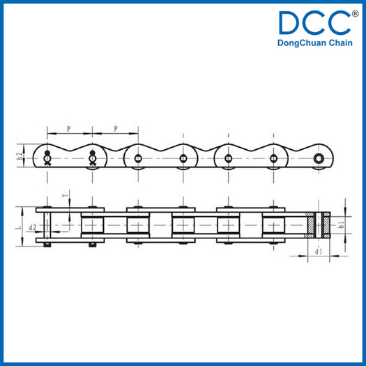 Pitch P (mm) | Inner width of inner link b1 (mm) | Diameter of roller d1 (mm) | Diameter of pin d2 (mm) | Length of pin L (mm) | Height of sidebar h2 (mm) | Thickness of sidebar T (mm) | Height of attached plate H2 (mm) | Tensile strength Q (KN) |