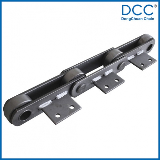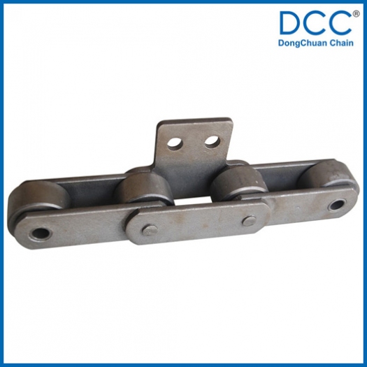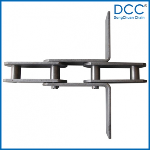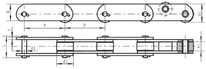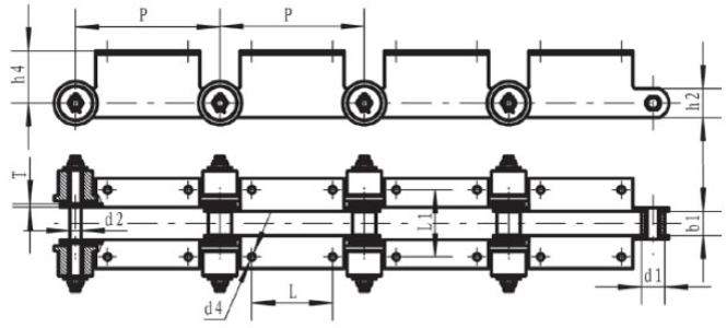 Pitch P (mm) | Inner width of inner link b1 (mm) | Diameter of pin d2 (mm) | Diameter of roller d1 (mm) | Height of sidebar h2 (mm) | Thickness of sidebar T (mm) | Pitch of attachment L (mm) | Central distance of attachment L1 (mm) | Hole diameter of attachment d4 (mm) | Height of attached side plate h4 (mm) | Tensile strength (KN) |