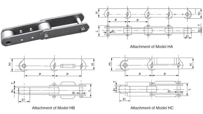 pitch P (mm) | Inner width of inner link b1 (mm) | Diameter of pin d2 (mm) | Diameter of roller d1 (mm) | Height of sidebar h2 (mm) | Thickness of sidebar T (mm) | Pitch of attachment L (mm) | Central distance of attachment L1 (mm) | Hole diameter of attachment d4 (mm) | Height of attached side plate h4 (mm) | Tensile strength (KN) |