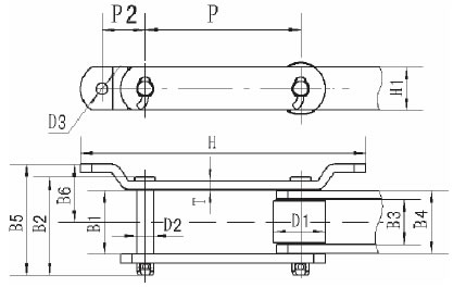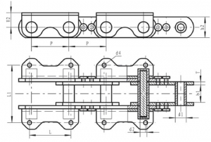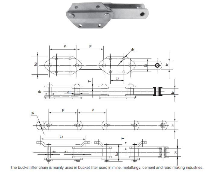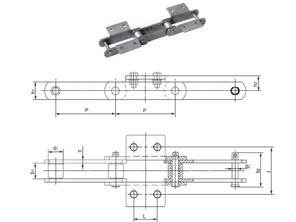 Chain No. | Pitch P (mm) | Diameter of roller d1 (mm) | Diameter of pin d2 (mm) | Length of pin L (mm) | Inner width of inner link b1 (mm) | Thickness of sidebar T (mm) | Height of sidebar h2 (mm) | Height of attachment h2 (mm) | Tensile strength Q (min.)(KN) |