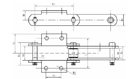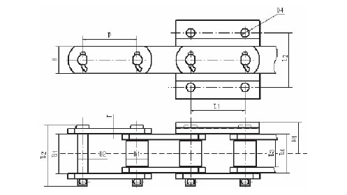 Chain No. | Pitch P (mm) | Inner width of inner link b1 (mm) | Diameter of roller d1 (mm) | Diameter of pin d2 (mm) | Height of sidebar h2 (mm) | Thickness of sidebar T (mm) | Hole height of attached plate (mm) | Central distance of attached plate L1(mm) | Hole diameter of attached plate d4 (mm) | Tensile strength Q(KN) |