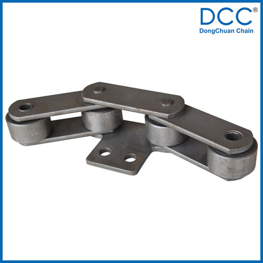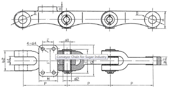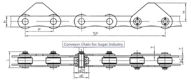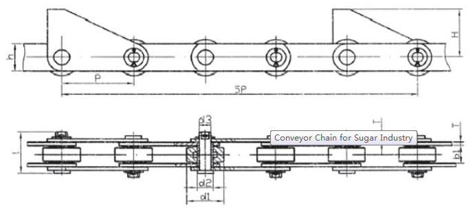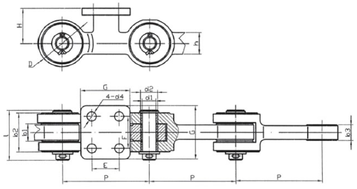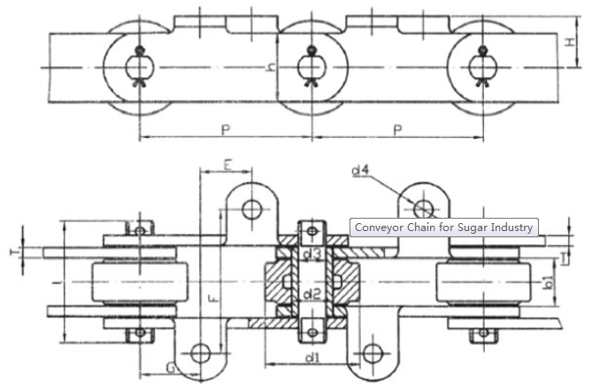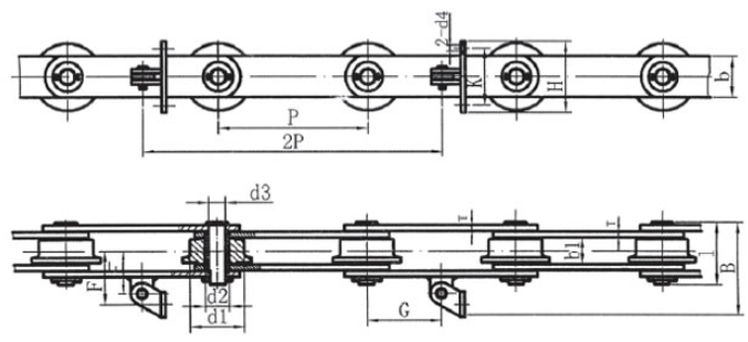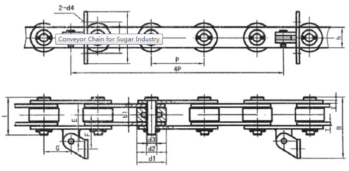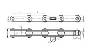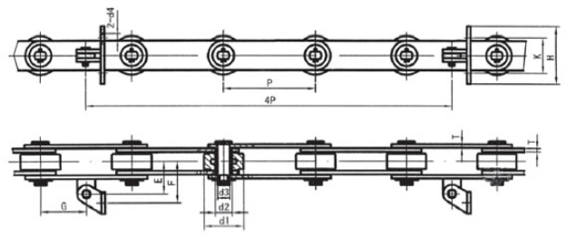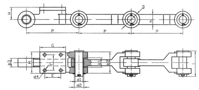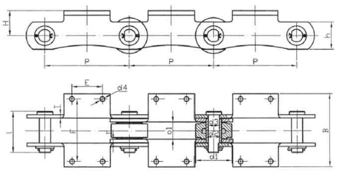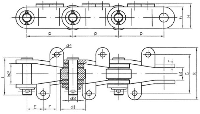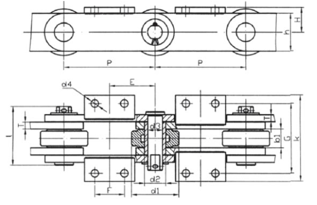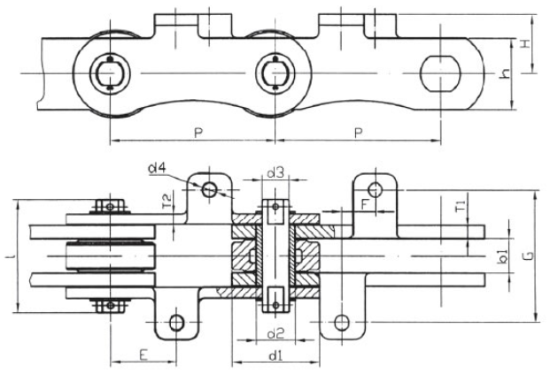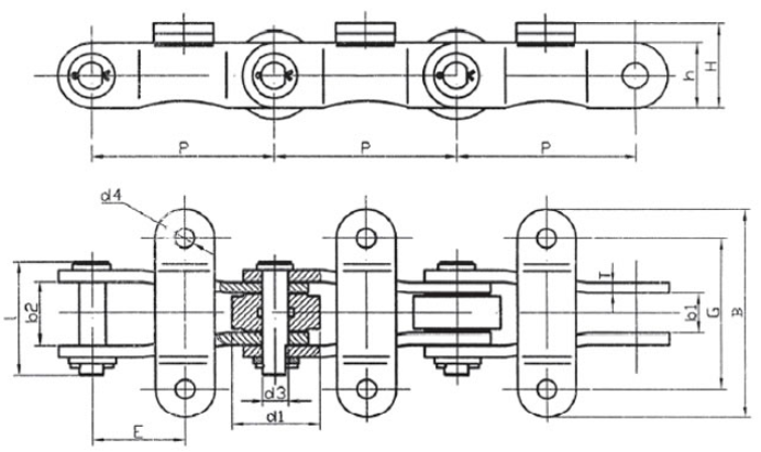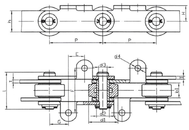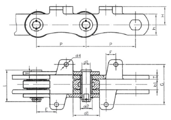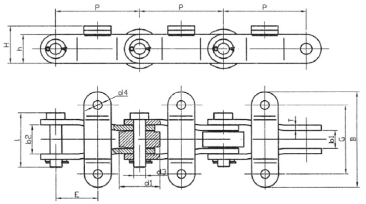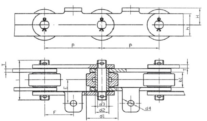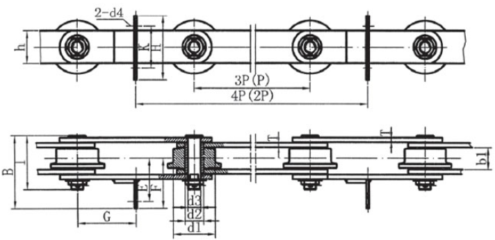Chain no. | Pitch P (mm) | Inner width of inner link b1 (min.) (mm) | Diameter of pin d3 (mm) | Diameter of roller d1 (min.) (mm) | Height of sidebar h (mm) | Thickness of sidebar T (mm) | Length of pin L (mm) | Central distance of attached plate f(mm) | Hole distance of attached plate L1(mm) | Hole diameter of attached plate d4(mm) | Spanning width of attached plate L2(mm) | Height of attached plate h4(mm) | Tensile strength (KN) |