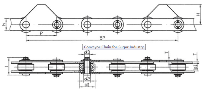 Chain No. | Pitch P (mm) | Diameter of roller d1 (min.) (mm) | Inner width of inner link b1 (min.) (mm) | Diameter of bushing d2(mm) | Diameter of pin d3 (mm) | Length of pin L (mm) | Height of sidebar h (mm) | Thickness of sidebar T (mm) | Other data | Breaking load Q (min.) (KN) | Weight per meter q (kg/m) |