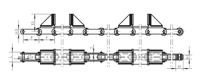 Pitch P (mm) | Inner width of inner link b1 (mm) | Diameter of roller d1 (mm) | Diameter of pin d2 (mm) | Length of pin L (mm) | Height of sidebar h2 (mm) | Thickness of sidebar T (mm) | Width of attached plate H2 (mm) | Tensile strength Q (KN) |