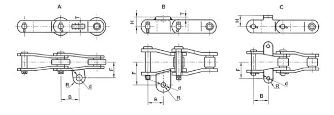 Matching chain no. | H (mm) | T (mm) | B (mm) | F (mm) | R (mm) | D (mm) | Attachment type |