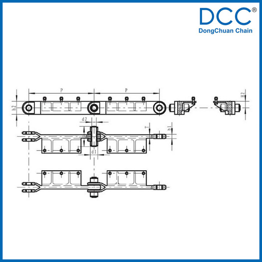 Chain No. | Pitch P (mm) | Inner width of inner link b1 (mm) | Diameter of roller d1 (mm) | Diameter of pin d2 (mm) | Height of sidebar h2 (mm) | Thickness of sidebar T (mm) | Height of platform H2 (mm) | Tensile strength Q (KN) |